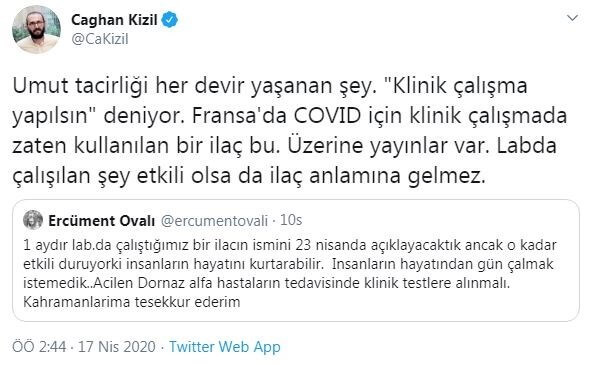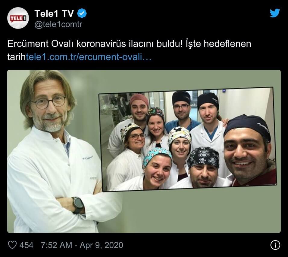 Prof. Dr. Ercüment Ovalı’nın sosyal medya hesabından yaptığı açıklamalar kamuoyunda koronavirüse karşı etkili ilaç ve aşı geliştirdikleri algısını oluşturmuştu. Zaman içerisinde yaptığı paylaşımlarda 23 Nisan’da koronavirüse karşı ilaç ve aşı açıklaması yapacağı müjdesinde bulunan Prof. Dr. Ovalı, 16 Nisan günü halihazırda klinik kullanımda olan bir ilacın ismini zikretmiş ve 17 Nisan günü de koronavirüse karşı ilaç bulmadığını, yanlış anlaşıldığını belirtmişti.