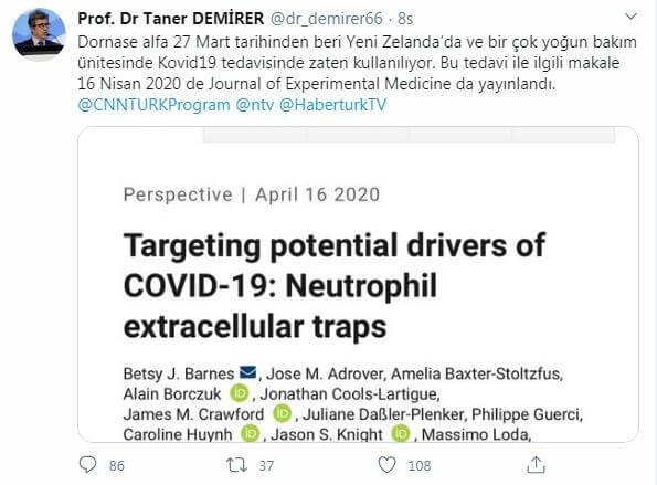 “Dornase alfa 27 Mart tarihinden beri Yeni Zelanda’da ve bir çok yoğun bakım ünitesinde Kovid19 tedavisinde zaten kullanılıyor. Bu tedavi ile ilgili makale 16 Nisan 2020 de Journal of Experimental Medicine da yayınlandı”