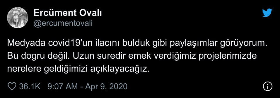 “Medyada covid19’un ilacını bulduk gibi paylaşımlar görüyorum. Bu dogru değil. Uzun suredir emek verdiğimiz projelerimizde nerelere geldiğimizi açıklayacağız.