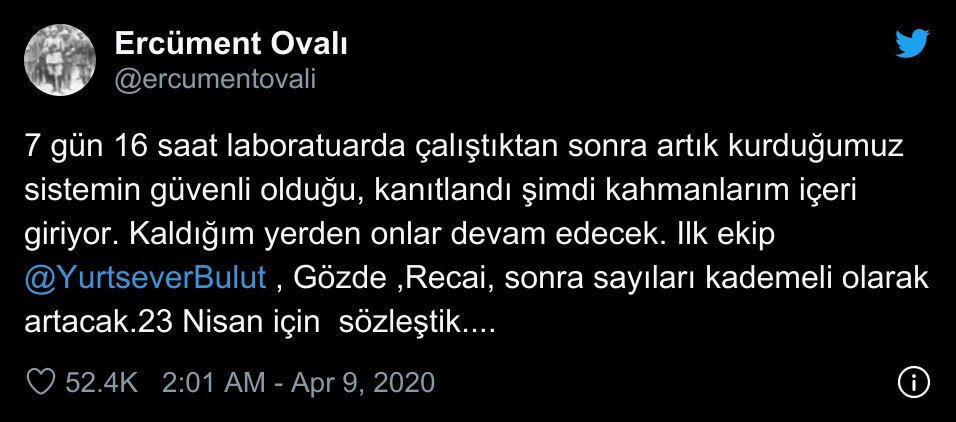 7 gün 16 saat laboratuarda çalıştıktan sonra artık kurduğumuz sistemin güvenli olduğu, kanıtlandı şimdi kahmanlarım içeri giriyor. Kaldığım yerden onlar devam edecek. Ilk ekip @YurtseverBulut , Gözde ,Recai, sonra sayıları kademeli olarak artacak.23 Nisan için sözleştik….”