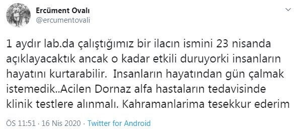 “1 aydır laboratuvarda çalıştığımız bir ilacın ismini 23 Nisan’da açıklayacaktık ancak o kadar etkili duruyor ki insanların hayatını kurtarabilir. İnsanların hayatından gün çalmak istemedik. Acilen Dornaz alfa hastaların tedavisinde klinik testlere alınmalı. Kahramanlarıma teşekkür ederim”