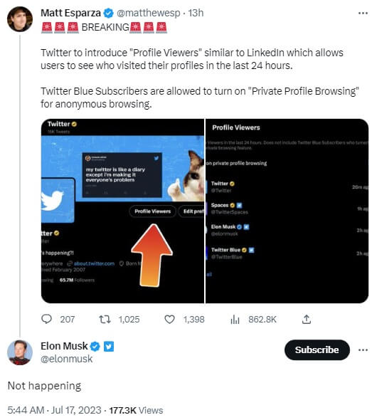 Elon Musk, konuyla ilgili bir paylaşıma verdiği “not happening“(“olmayacak“) şeklindeki yanıtla Twitter profillerini ziyaret eden kişilerin gösterileceği iddiasını yalanlamış.