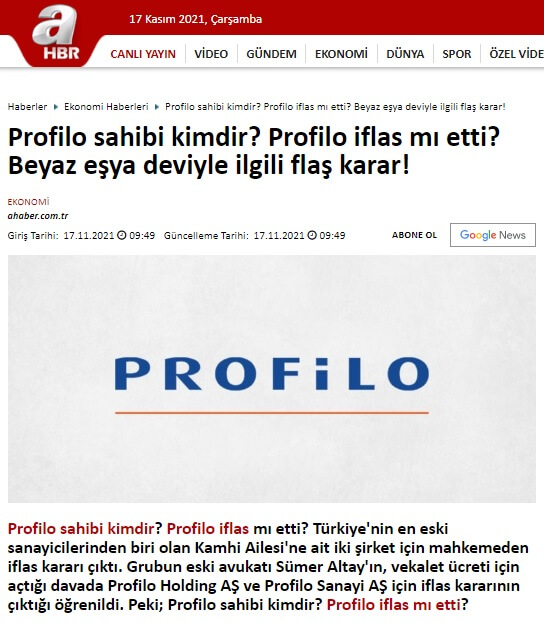 Aynı hataya “Profilo sahibi kimdir? Profilo iflas mı etti? Beyaz eşya deviyle ilgili flaş karar!” başlıklı tık tuzağı stili haberinde A Haber de düşmüştü.