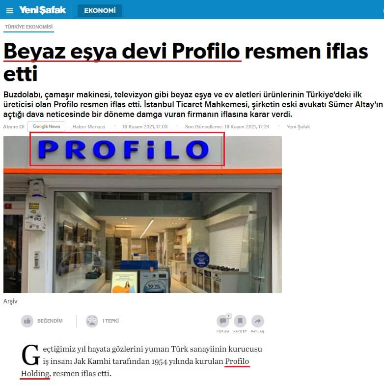 Yeni Şafak, Profilo Beyaz Eşya’nın logosunu kullandığı “Beyaz eşya devi Profilo resmen iflas etti” başlıklı haberinin içeriğinde Profilo Holding’in resmen iflas ettiğini aktarmıştı.