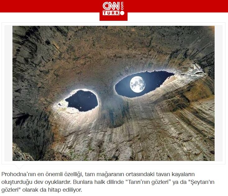 Halk arasında “Tanrının Gözleri” ya da “Şeytanın Gözleri” olarak anılan Prohodna Mağarası‘ndaki bu oyuklardan karanlıkta Ay’ın göründüğü ana ait olduğu iddiasıyla bir görselin, sosyal medyada ve haber sitelerinde paylaşıldığına şahit oluyoruz.