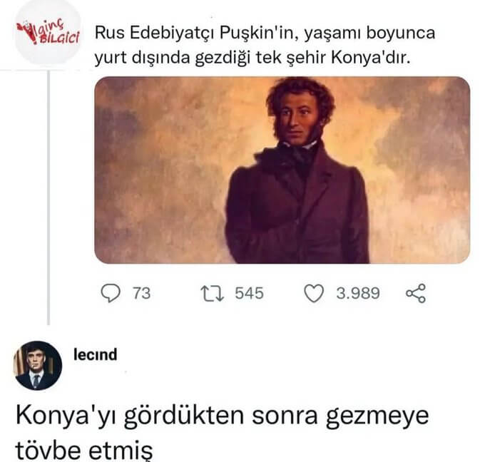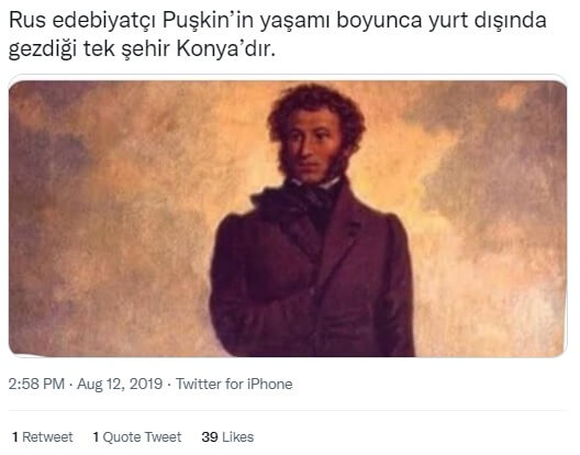 Aleksandr Puşkin, hayatında hiç Konya’da bulunmadı.