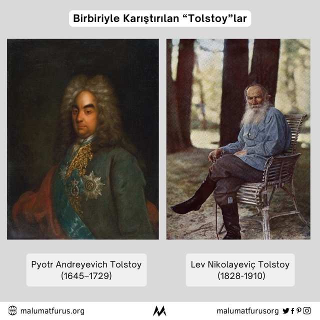 Ünlü Rus yazar Lev Nikolayeviç Tolstoy’u (1828-1910) büyük dedesi Kont Pyotr Andreyevich Tolstoy’la (Пётр Андреевич Толстой) (1645–1729) karıştıran güncel bir örneği aktaracağız…