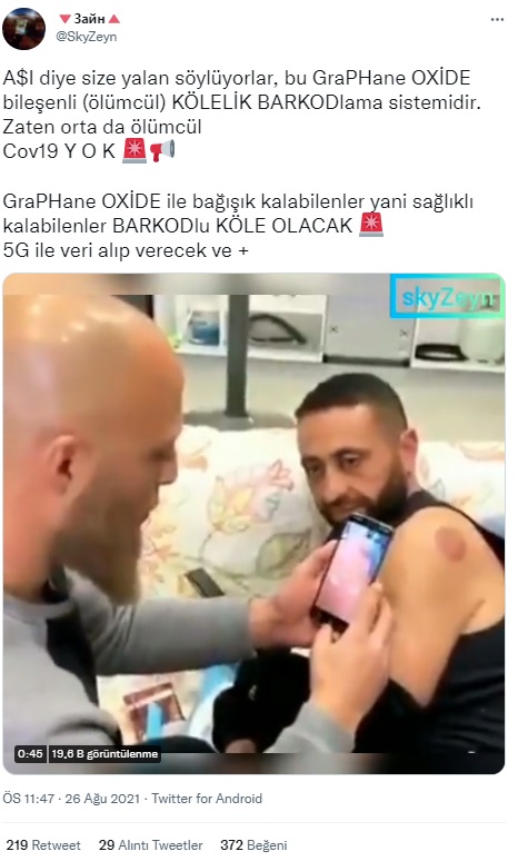 Öncelikle belirtmek gerekir ki, video içeriği grafen oksitle ilgili değil. Videodaki kişilerin QR kod tarayıcı ile aşılanan kol üzerinden “çip” tespiti yaptıklarını ileri sürdükleri anlaşılıyor. Yani, videoyu sosyal medyada paylaşan kişi içeriğindeki saçmalığı çarpıtarak aktarmış.
