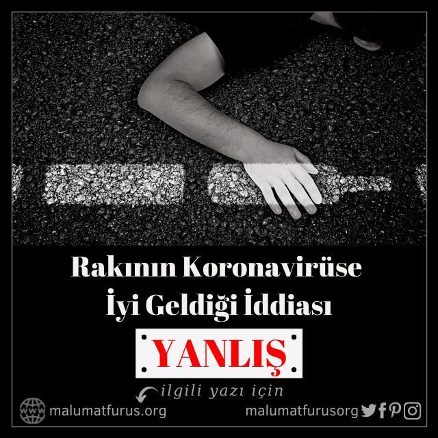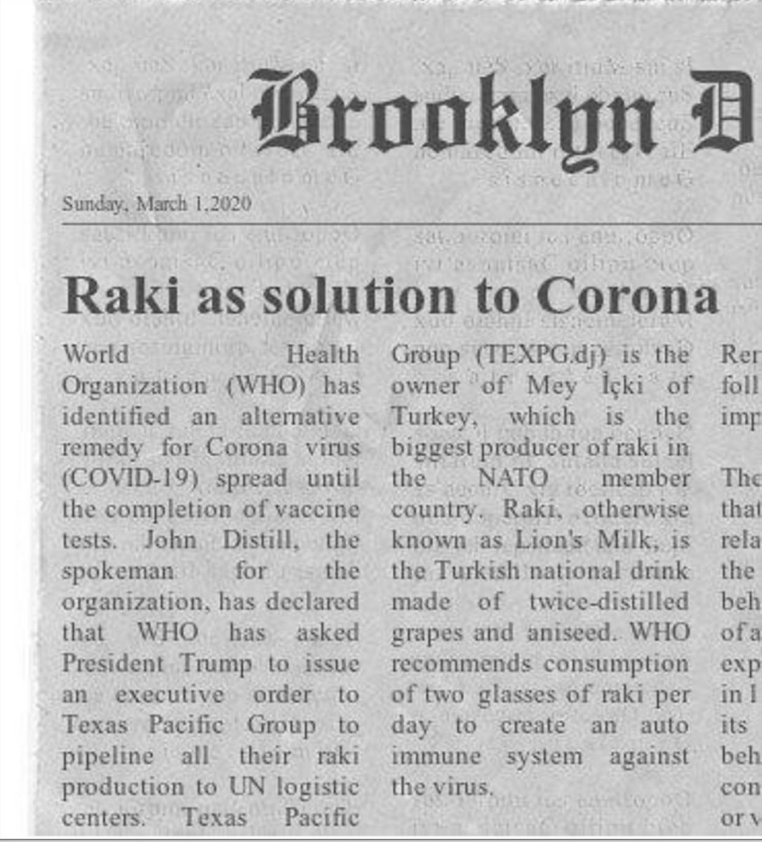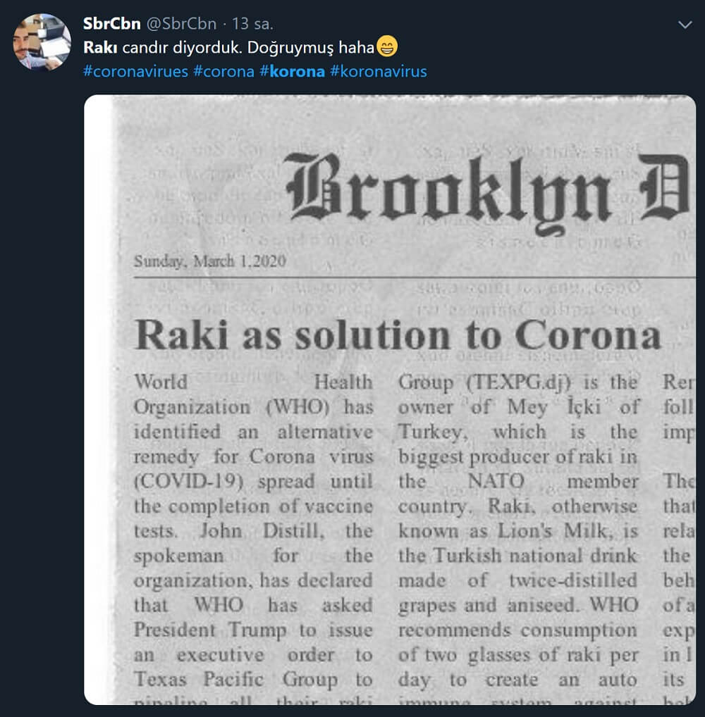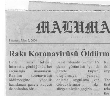 Rakının koronavirüse iyi geldiği iddiasını içeren sahte gazete küpürü bir uygulama vasıtasıyla oluşturulmuştur. Bu yönde yayımlanmış bir gazete haberi yayınına rastlanamamaktadır. Halihazırda koronavirüsün tedavisine yönelik somut bir bulgu ya da virüse etkili bir ilaç bulunamamıştır.