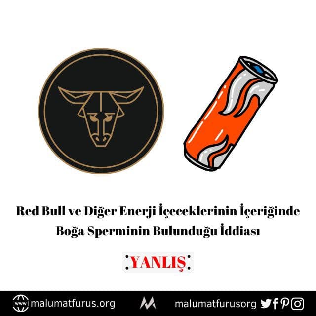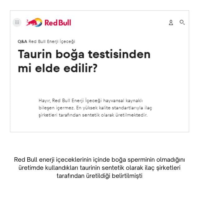 Red Bull ve diğer enerji içeceklerinin boğa idrarı ve sperminden elde edilen bir madde içerdiği iddiası doğru değil. Red Bull, ürünlerinde boğa spermi veya herhangi bir hayvansal ürün içermediğini açıklamıştı. Red Bull gibi enerji içeceklerinin içerisinde taurin bulunmaktadır. İnsan vücudunda da bulunan bir aminoasit olan taurin, boğa sperminden üretilebilmektedir. Ancak, enerji içeceklerinin kullandığı taurin sentetiktir. Red Bull ve diğer enerji içeceklerinin boğa spermi içerdiği yönündeki yanlış algının, Red Bull’un ürün adı ve logosunun boğa içermesi nedeniyle yaygınlaştığı anlaşılmaktadır.