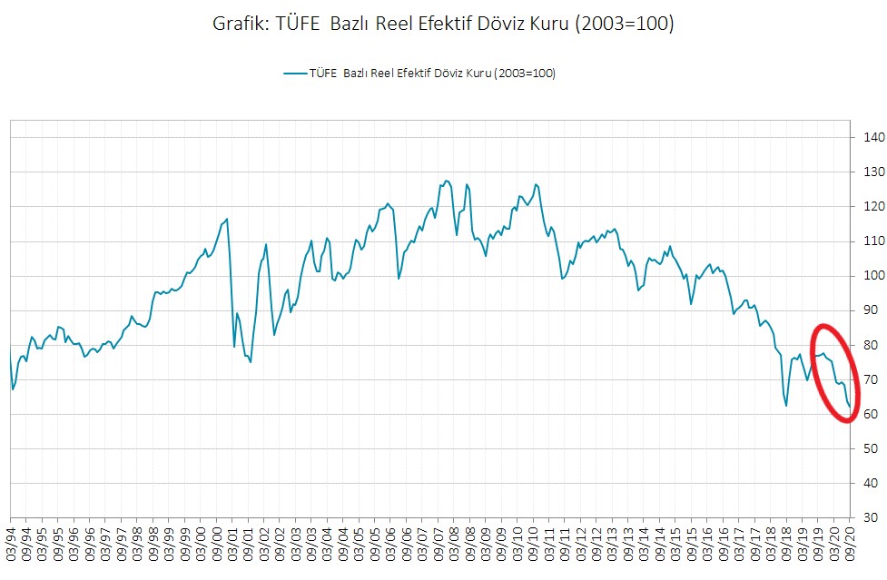 "2003 yılından bu yana Merkez Bankası'nın (TCMB) takip ettiği reel efektif döviz kuru en kötü noktasına ulaşarak 95 seviyesine geriledi."