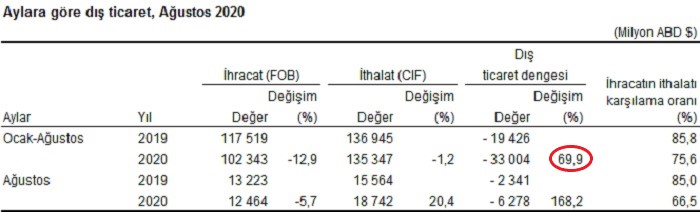 REK endeksinin 2019 yılı Eylül ayından bu yana, yani son bir yıldır düşmekte olduğu ve yaklaşık 15 puan gerilediği görülmektedir. Dolayısıyla son bir yılda dış ticaret verilerimizde olumlu bir gelişme olması beklenmelidir. Ancak TÜİK tarafından açıklanan en son dış ticaret dengesi verilerine göre, Ocak-Ağustos dış ticaret dengesi 2019 yılında -19,4 milyar dolardan, 2020 yılında -33 milyar dolara gerilemiştir. Yani reel kur düşüşü dış ticareti beklendiği gibi etkileyememiştir.