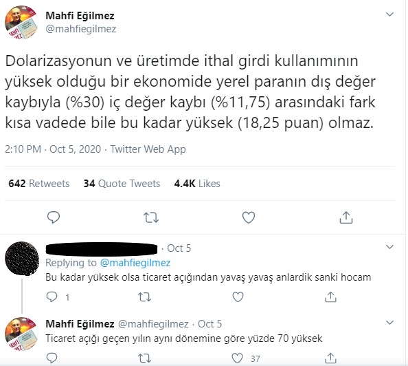 Bu noktada, ekonomist Mahfi Eğilmez’in, döviz kurları ile açıklanan enflasyon verileri arasındaki tutarsızlığa dikkat çektiği twitter mesajını hatırlamakta fayda var. Sayın Eğilmez döviz kurlarındaki kaybın, yani paramızın dış değer kaybının %30, enflasyonun yani iç değer kaybının %11,75 olmasında bir anormallik olduğunu ifade etmektedir. Bir takipçisinin yorumu üzerine ise dış ticarette de ciddi düzeyde kötüleşme olduğunu belirterek, bir anlamda REK endeksinin çalışmadığının altını çizmektedir.