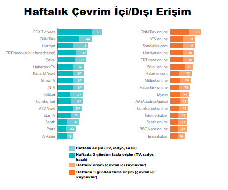 En çok güvenilen kaynaklarsa şöyle sıralanmış: Fox TV, NTV, Sözcü, Habertürk, Cumhuriyet, CNN Türk, TRT, Anadolu Ajansı, Kanal D, Hürriyet, Milliyet, Show TV, Oda TV, Sabah, A Haber.