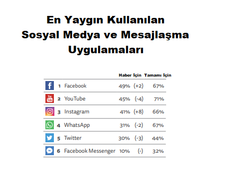 En yaygın kullanılan sosyal medya ve sohbet uygulamaları şöyle sıralanmış: Facebook, Youtube, Instagram, Whatsapp, Twitter.