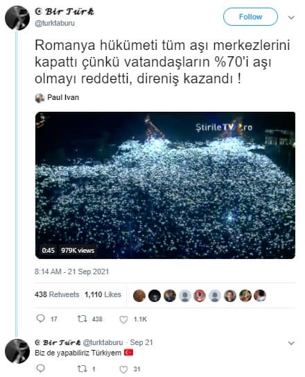 “Romanya’da; Halkın yüzde yetmişi asi zorlanmasına karsi çıktığı için hükümet asi uygulamasını sonlandırdı. Zihni ve beynini kullanmayan, aşağılık kompleksi olanlar, aşı oldum havasına giren vatandaşları olan geri kalmış ülkelerde asi kuyrukları devam ediyor.”