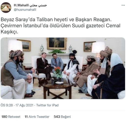“Beyaz Saray’da Taliban heyeti ve Başkan Reagan. Çevirmen İstanbul’da öldürülen Suudi gazeteci Cemal Kaşıkçı.”