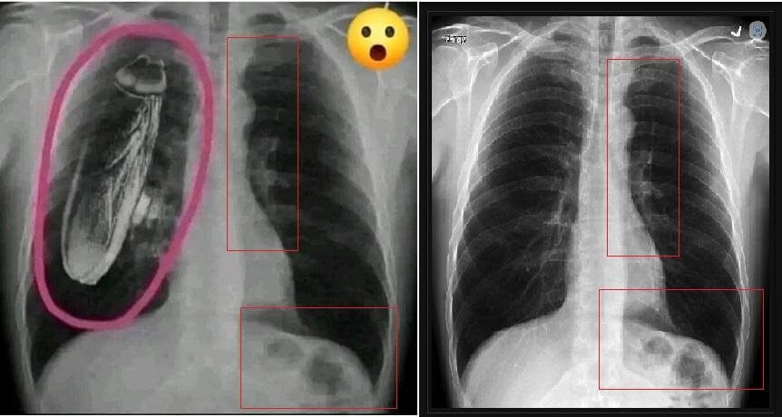 İddiaya göre, Kenya’da göğüs ağrısı şikayetiyle hastaneye başvuran bir hastaya röntgen çekilmiş ve sonucunda göğüs kafesinin içinde canlı bir hamamböceği tespit edilmiş. Akabinde, Kenya’daki doktorlar hastaya acil ameliyat önermiş ve Singapur’a yönlendirmiş. Singapur’daki doktorlar ise yaptıkları incelemede hastanın göğsünde herhangi bir böcek bulunmadığını tespit etmiş. Röntgen filminde görülen hamamböceği siluetinin aslında Kenya’daki röntgen cihazının içine giren bir böcekten kaynaklandığını anlaşılmış.