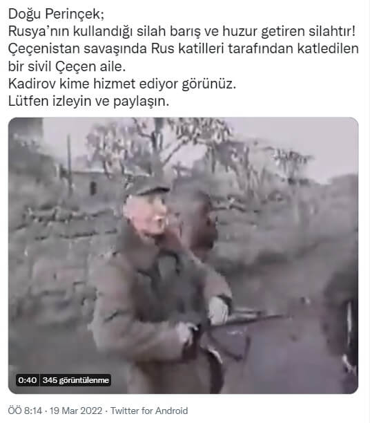 Bahse konu video, Rusya’nın Ukrayna’yı işgalini haklı çıkarma motivasyonuyla Ukraynalı askerlerin Çeçenya’da acımasızca sivilleri öldürdüğü anı yansıttığı iddiasıyla da servis edilmişti. İlgili paylaşımlarda kullanılan ifadeler şu şekildeydi: