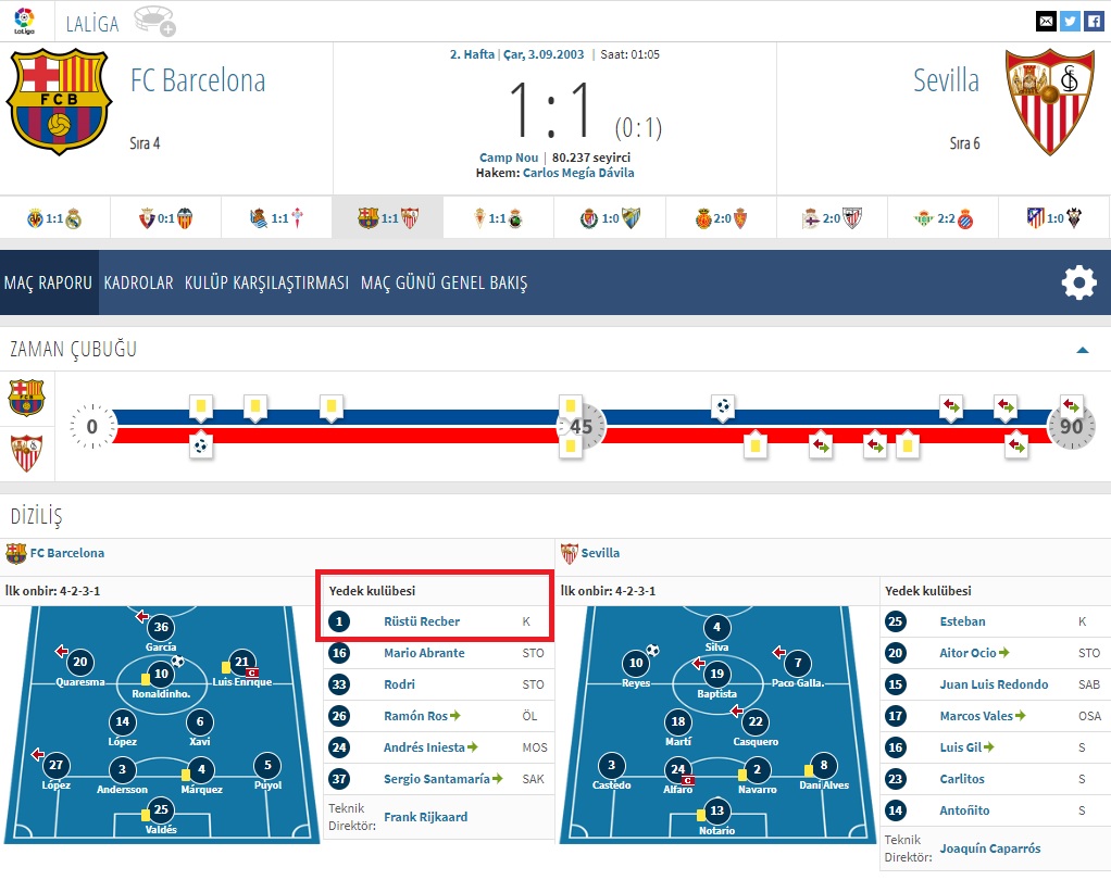 Barcelona FC’nin internet sitesinde ve diğer internet sitelerinde sunulan maç istatistiklerinde Rüştü’nün bahse konu maçta yedek kulübesinde oturduğu görülebiliyor.