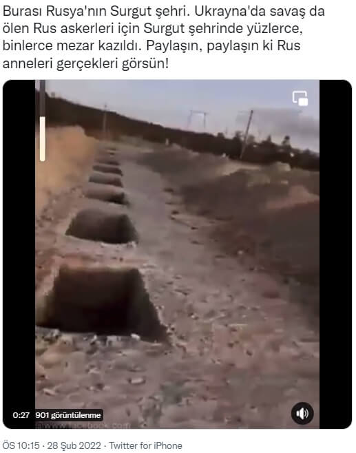 “Burası Rusya’nın Surgut şehri. Ukrayna’da savaş da ölen Rus askerleri için Surgut şehrinde yüzlerce, binlerce mezar kazıldı. Paylaşın, paylaşın ki Rus anneleri gerçekleri görsün!”