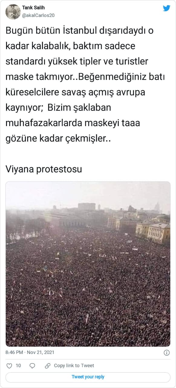 “Bugün bütün İstanbul dışarıdaydı o kadar kalabalık, baktım sadece standardı yüksek tipler ve turistler maske takmıyor.. Beğenmediğiniz batı küreselcilere savaş açmış avrupa kaynıyor; Bizim şaklaban muhafazakarlarda maskeyi taaa gözüne kadar çekmişler.. Viyana protestosu”