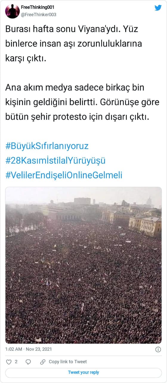 “Burası hafta sonu Viyana’ydı. Yüz binlerce insan aşı zorunluluklarına karşı çıktı. Ana akım medya sadece birkaç bin kişinin geldiğini belirtti. Görünüşe göre bütün şehir protesto için dışarı çıktı. #BüyükSıfırlanıyoruz #28KasımİstilalYürüyüşü #VelilerEndişeliOnlineGelmeli”
