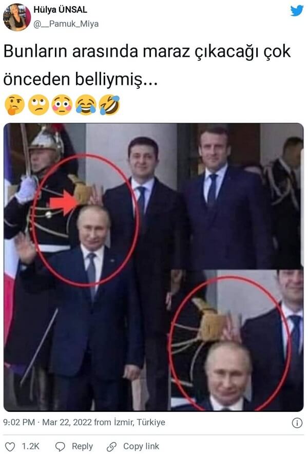 Volodimir Zelenskiy’in Emmanuel Macron ile 9 Aralık 2019 tarihli fotoğrafına Vladimir Putin’in montajlanmasıyla, Zelenskiy’in Putin’in arkasından eliyle barış / zafer / kulak işareti yapıldığı algısı oluşturulmuştu.