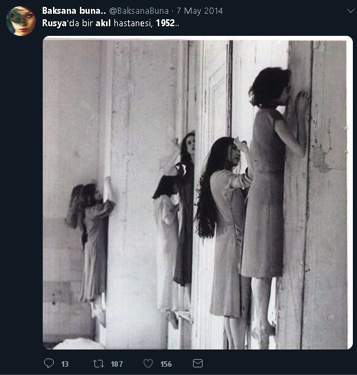 Duvarda asılı duran kadınları içeren fotoğrafın Rusya’daki bir akıl hastanesinde 1952 yılında çekildiği iddiası doğru değil. Bahse konu fotoğraf, Pina Bausch’un 1977 yılında sergilediği Blaubert adlı oyundan bir sahne. Ayrıca, kadınların duvarda asılı durmalarını sağlayan özel delikler mevcut.