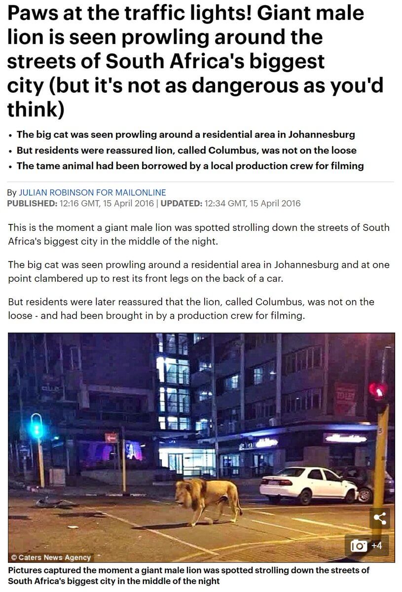 Yerel bir yapım şirketinin bir sahne çekimi için kontrollü şekilde saldığı aslan fotoğrafı, Daily Mail adlı yayının 15 Nisan 2016 tarihli “Trafik lambalarında patiler! Kocaman erkek aslanın Güney Afrika’nın en büyük kentinin sokaklarıda gezdiği görüldü” (“Paws at the traffic lights! Giant male lion is seen prowling around the streets of South Africa’s biggest city“) başlıklı haberinde de kullanılmıştı.