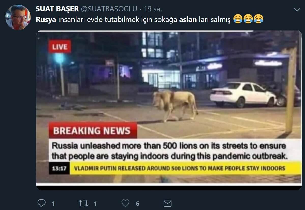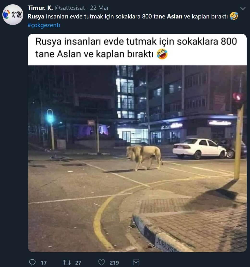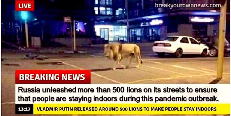 Rusya’nın vatandaşlarını karantinaya uymaya zorlamak ve evlerden çıkmamalarını sağlamak için yırtıcı aslanları sokağa saldığı iddiası elbette doğru değil.