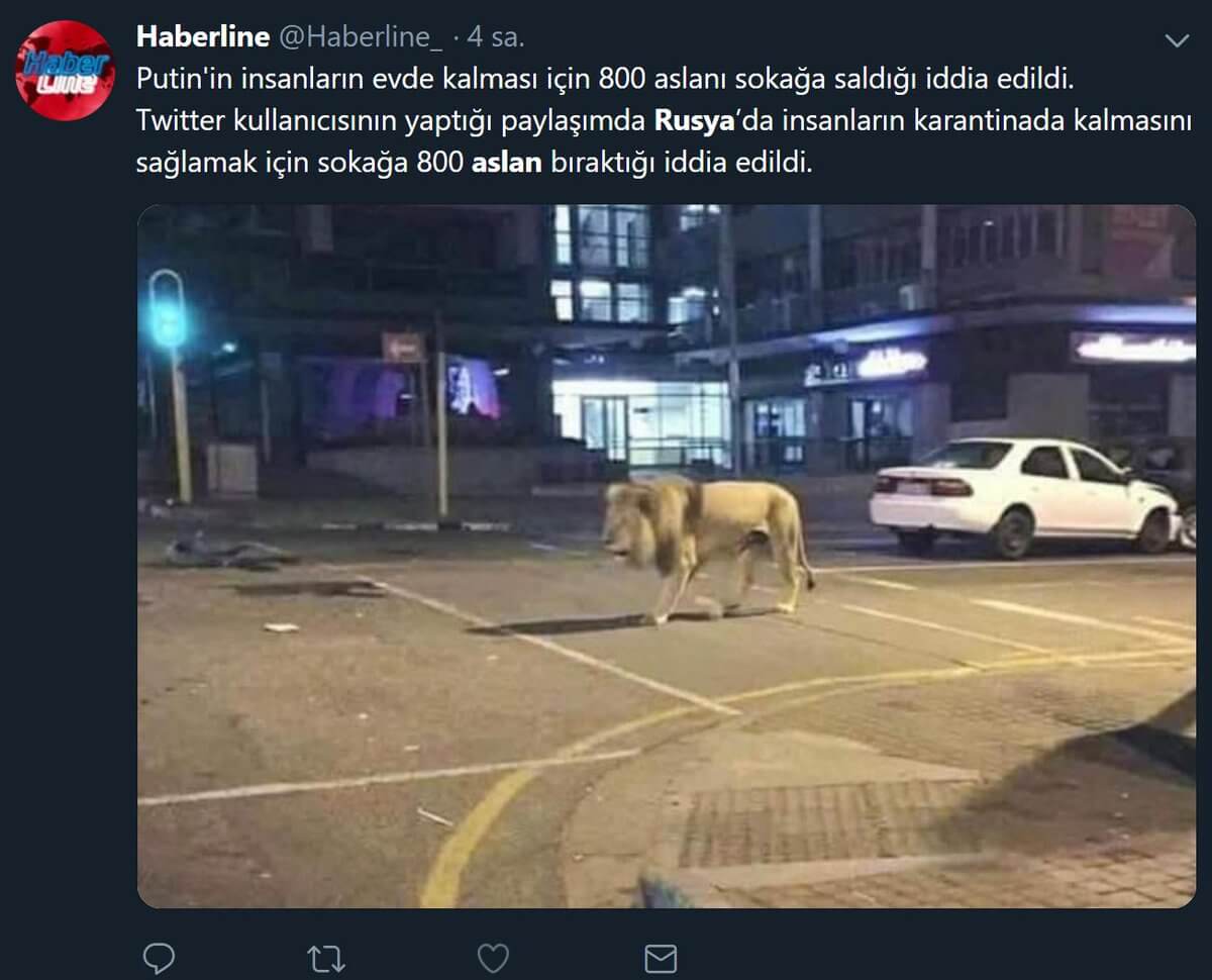 Rusya Devlet Başkanı Vladimir Putin, vatandaşlarının koronavirüse karşı evlerinde kalması için sokaklara 500 aslan salmadı. Sokakta bir aslanın gezerken görüldüğü fotoğraf, 2016 yılı Nisan ayında Güney Afrika’nın Johannesburg şehrinde bir film çekimi esnasında çekilmiş. Aslanın adı Colombus. Çekim esnasında etraf güvenlik çemberine alınmış.