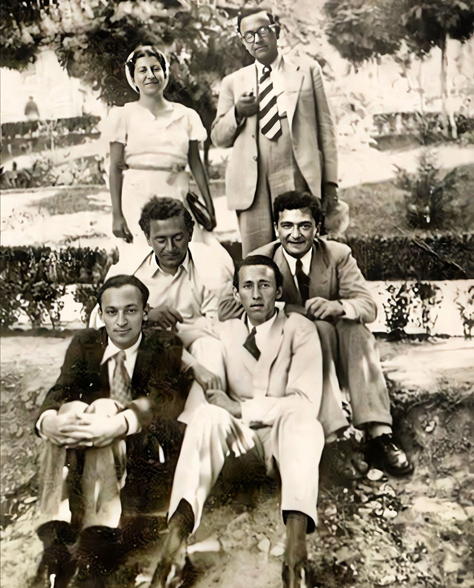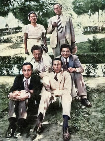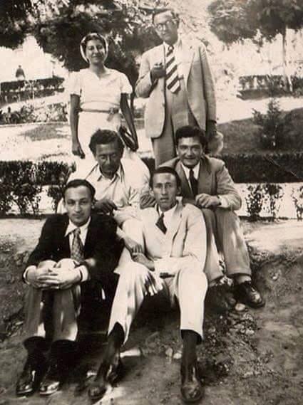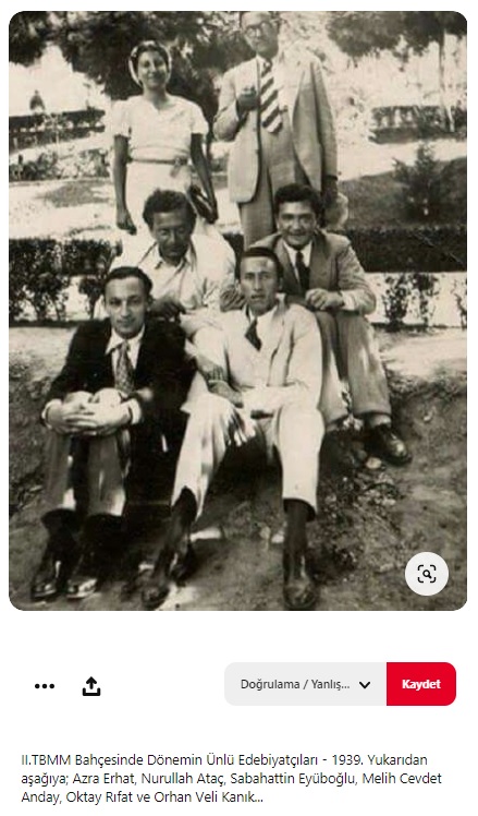 “II.TBMM Bahçesinde Dönemin Ünlü Edebiyatçıları – 1939. Yukarıdan aşağıya; Azra Erhat, Nurullah Ataç, Sabahattin Eyüboğlu, Melih Cevdet Anday, Oktay Rıfat ve Orhan Veli Kanık…”