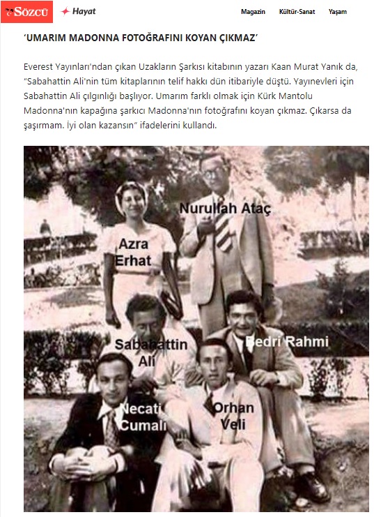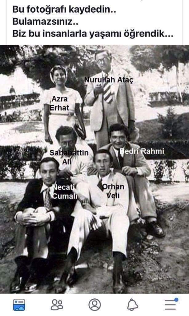 Sanılanın aksine fotoğrafta Sabahattin Ali yer almıyor. Sabahattin Ali sanılan kişi aslında Bela Szabo. Fotoğrafta görülen 6 kişi şu şekilde: Azra Erhat, Nurullah Ataç, Bela Szabo, Bedri Rahmi Eyüboğlu, Necati Cumalı, Orhan Veli Kanık…