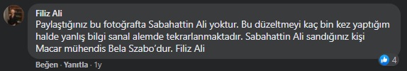 “Paylaştığınız bu fotoğrafta Sabahattin Ali yoktur. Bu düzeltmeyi kaç bin kez yaptığım halde yanlış bilgi sanal alemde tekrarlanmaktadır. Sabahattin Ali sandığınız kişi Macar mühendis Bela Szabo’dur. Filiz Ali”