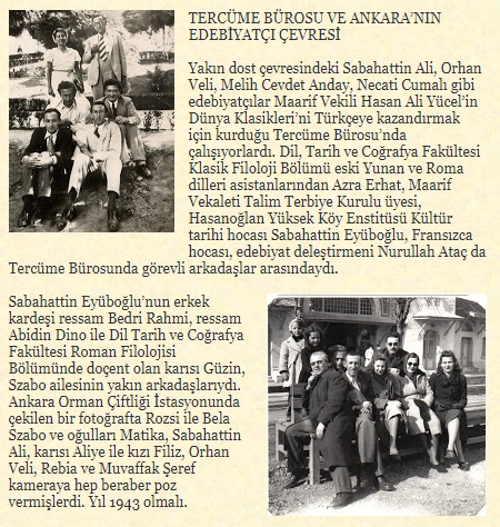 “Yakın dost çevresindeki Sabahattin Ali, Orhan Veli, Melih Cevdet Anday, Necati Cumalı gibi edebiyatçılar Maarif Vekili Hasan Ali Yücel’in Dünya Klasikleri’ni Türkçeye kazandırmak için kurduğu Tercüme Bürosu’nda çalışıyorlardı. Dil, Tarih ve Coğrafya Fakültesi Klasik Filoloji Bölümü eski Yunan ve Roma dilleri asistanlarından Azra Erhat, Maarif Vekaleti Talim Terbiye Kurulu üyesi, Hasanoğlan Yüksek Köy Enstitüsü Kültür tarihi hocası Sabahattin Eyüboğlu, Fransızca hocası, edebiyat eleştirmeni Nurullah Ataç da Tercüme Bürosunda görevli arkadaşlar arasındaydı.