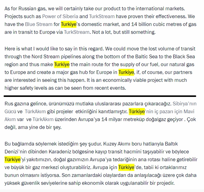 “Rus gazına gelince, ürünümüzü mutlaka uluslararası pazarlara çıkaracağız. Sibirya’nın Gücü ve TürkAkım gibi projeler etkinliğini kanıtlamıştır. Türkiye’nin iç pazarı için Mavi Akım var ve TürkAkım üzerinden Avrupa’ya 14 milyar metreküp doğalgaz geçiyor . Çok değil, ama yine de bir şey.