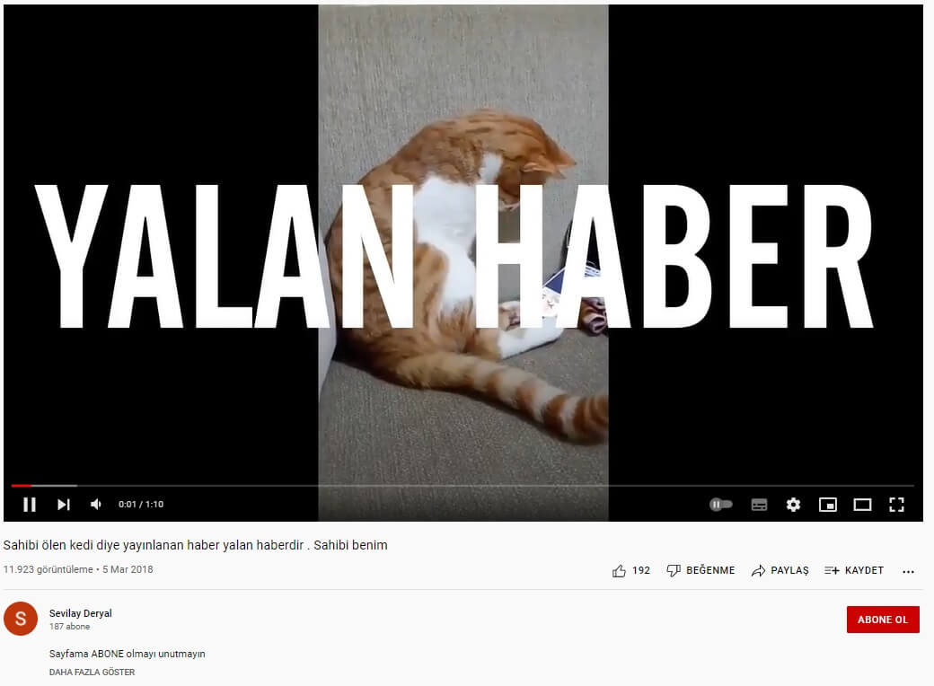 “Güzel bir senaryo oluşturmuşlar ama yalan haber. İnsanların duygularıyla oynadılar. Ve hatta birisi benim ölmediğimi öğrenince bana yazdı ‘oğlum sabahtan beri ağlıyor ne olur resim gönderin sussun’ diye, annesine ‘sahibi ölmüş, o kedi ağlıyor onu biz sahiplenelim’ diyormuş. İnsanların duygularıyla oynamasınlar çocuk, genç, yaşlı herkes bu habere çok üzülmüş. Ben hayvanları çok seviyorum, kızım da çok seviyor ama olmayan bir şeyi yayınlıyorlar ve ölen sahibi denilmesi benim canımı sıktı açıkçası. Beni tanıyanlar içerisinden bile sahibi ölmüş mü diye yorum yapanlar oldu.”