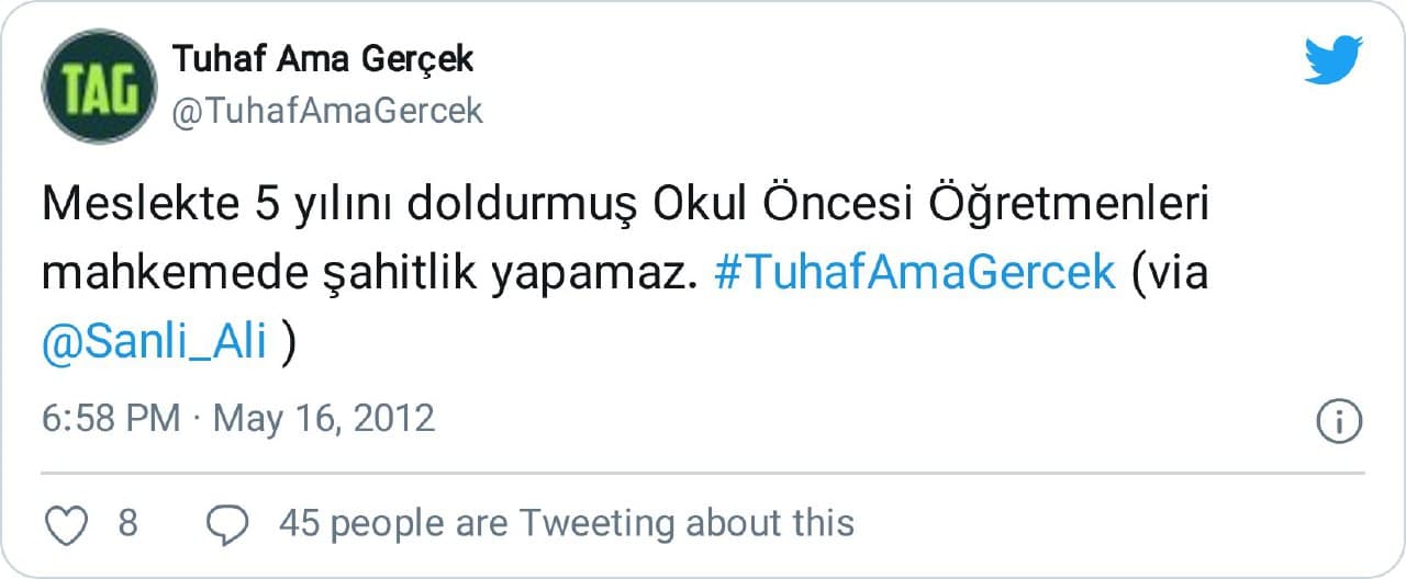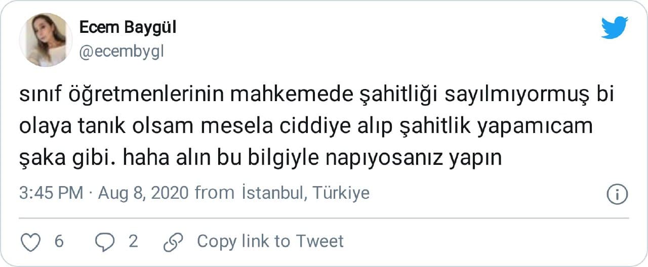 “sınıf öğretmenlerinin mahkemede şahitliği sayılmıyormuş bi olaya tanık olsam mesela ciddiye alıp şahitlik yapamıcam şaka gibi. haha alın bu bilgiyle napıyosanız yapın”
