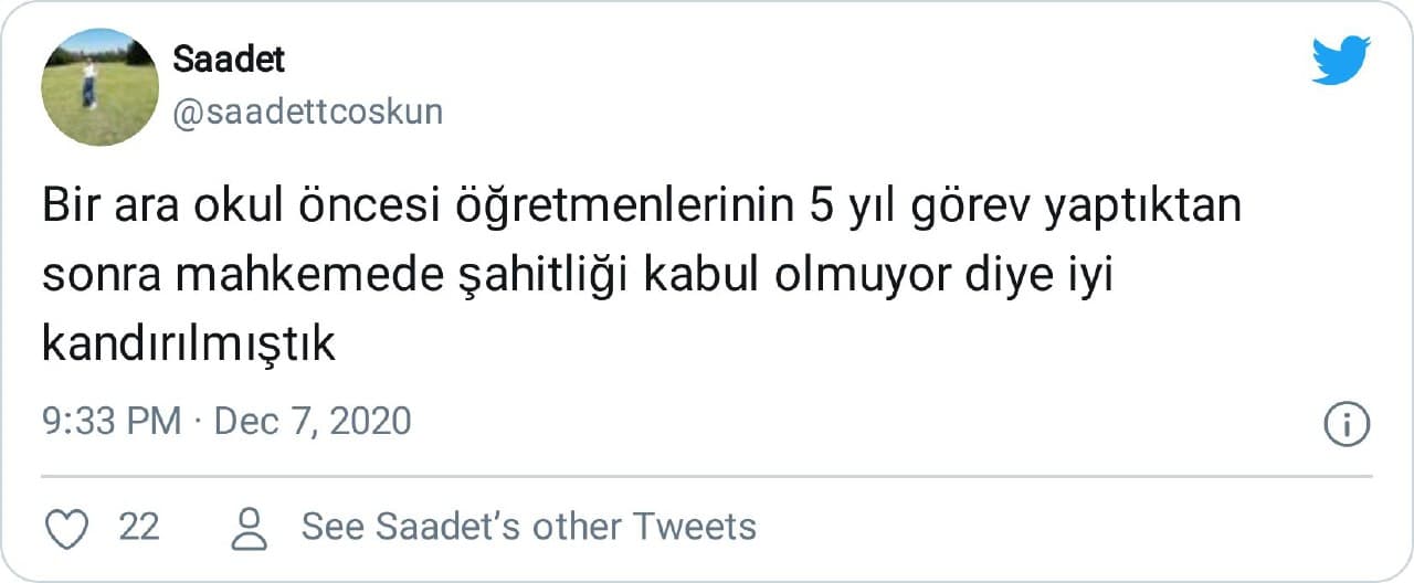 “Bir ara okul öncesi öğretmenlerinin 5 yıl görev yaptıktan sonra mahkemede şahitliği kabul olmuyor diye iyi kandırılmıştık”
