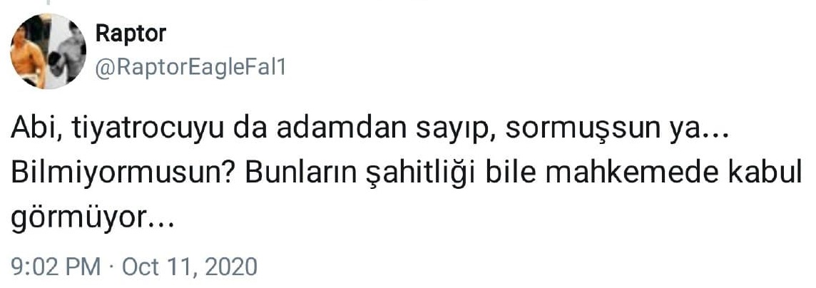 “Abi tiyatrocuyu da adamdan sayıp sormuşsun ya… Bilmiyor musun? Bunların şahitliği bile mahkemede kabul görmüyor…”