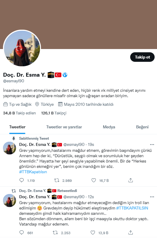 Doç. Dr. Esma Yılmaz kılığına bürünen ve doktorlar aleyhinde provokatif paylaşımlarda bulunan profil, daha önce Gamze Özçelik’i taklit ediyormuş. Gamze Özçelik, allahakuloldum uzantılı profil hakkında adını kullanarak IBAN verip para topladığı gerekçesiyle şikâyetçi olduğunu duyurmuştu.