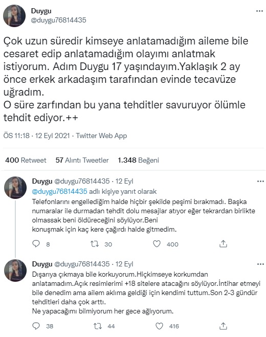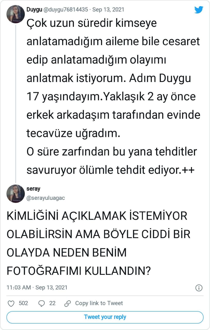 Tecavüze uğradığını ve ölüm tehditleri aldığını ileri süren Duygu adlı Twitter hesabının sahte profil olduğu anlaşılmıştı. Siber Suçlarla Mücadele Daire Başkanlığı tarafından yürütülen incelemede söz konusu hesabın Van’da yaşayan Ramazan U. adındaki 1999 doğumlu bir erkeğe ait olduğu tespit edildiği basına yansımıştı.