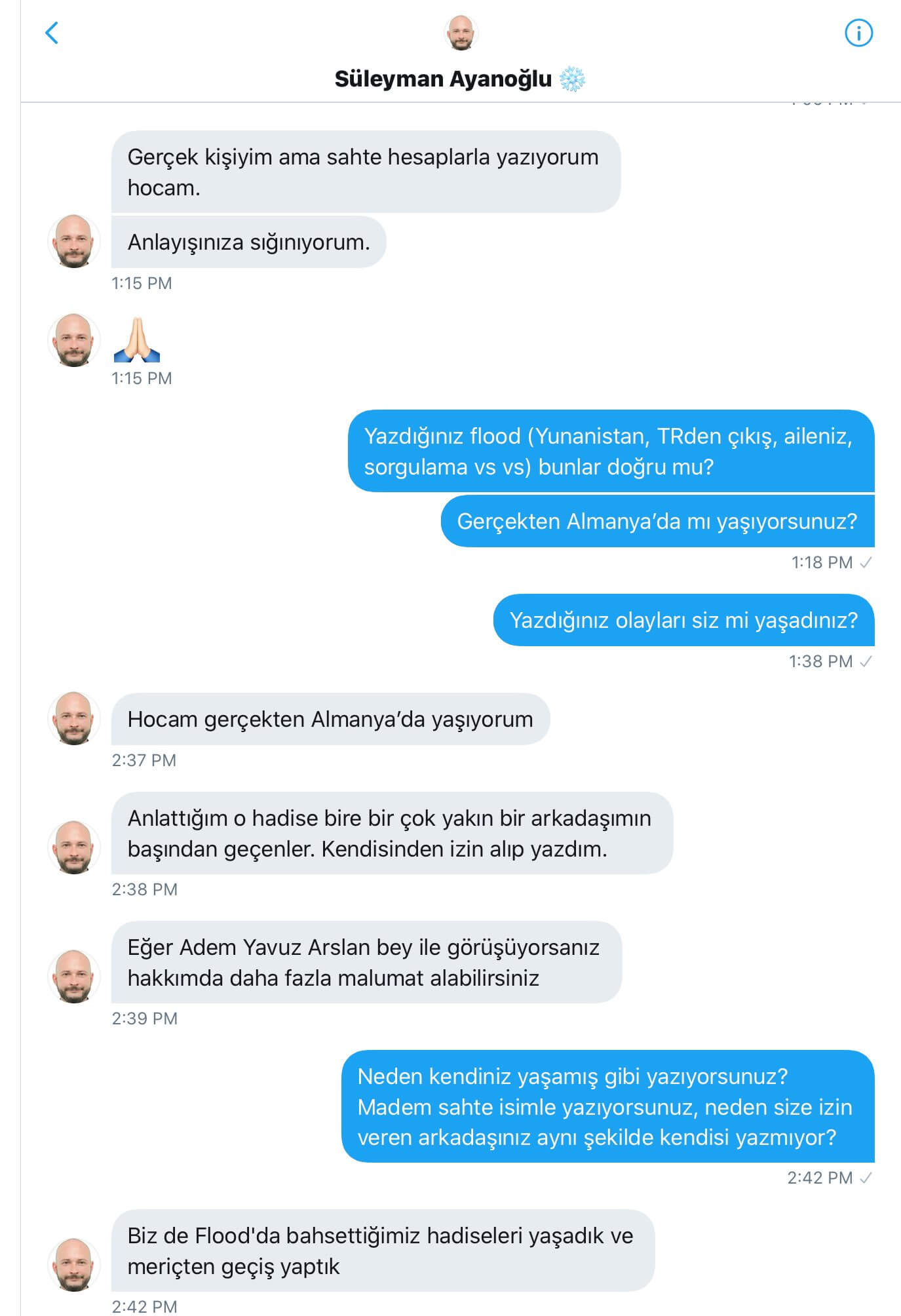 Bazı haber sitelerinde -kendi deyimiyle- “hikâye” silsilesi “Türkiye’den Neden Ayrıldım” başlığıyla paylaşılan F tipi sahte hesabın Almanya’da yaşadığını, gerçek kişi olduğunu ancak sahte hesaplarla yazdığını aktardığı özel mesajlar şu şekilde idi: