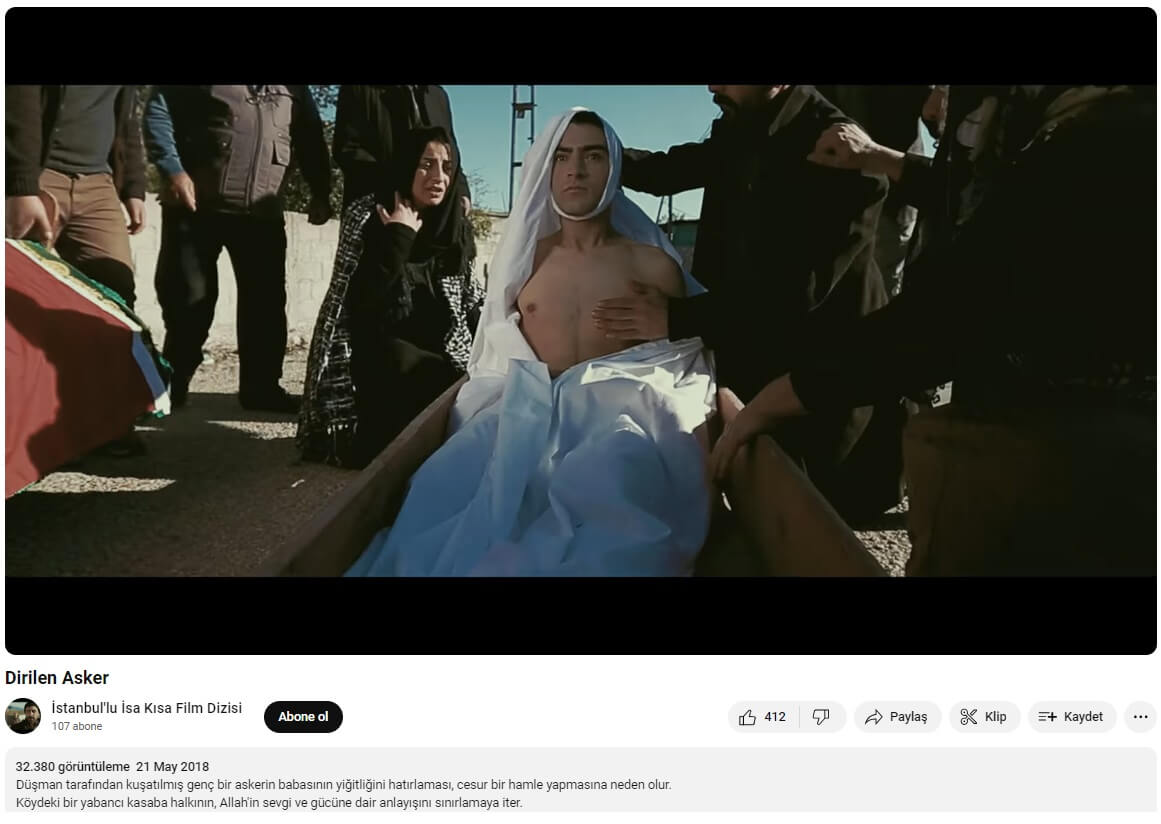 İLAVE: Filistinlilerin sahte cenaze törenine ait olduğu iddiasıyla paylaşılan tabutta kefenli vaziyetteyken canlanan kişinin görüldüğü video İstanbullu İsa adlı kısa filmden alınan “dirilen asker” temalı kesit.