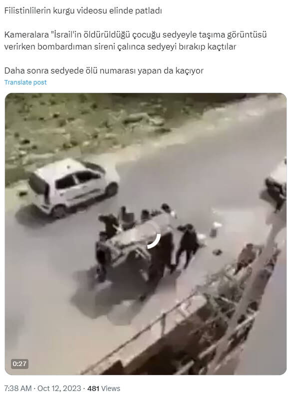 Rosa Kurd (@rosakurdistan): “Filistinlilerin kurgu videosu elinde patladı Kameralara “İsrail’in öldürüldüğü çocuğu sedyeyle taşıma görüntüsü verirken bombardıman sireni çalınca sedyeyi bırakıp kaçtılar Daha sonra sedyede ölü numarası yapan da kaçıyor”