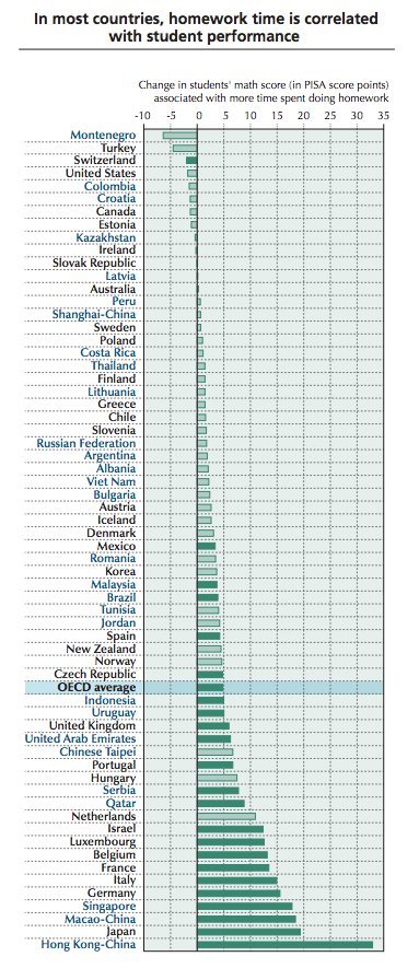 Öğrencilerin ev ödevlerine harcadıkları ortalama zaman ile başarıları arasında pozitif korelasyon olduğu düşünülür. Ancak, OECD çalışmasına göre ülkeler arasında bu yönde bir korelasyon gözlemlenmemektedir. Japonya’da ödev için harcanan zaman ile başarı artarken, Türkiye’de düşmektedir.