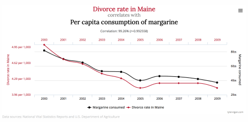 Ya da (Maine eyaletindeki) kişi başına margarin harcaması ile boşanma oranları ilişkisi…