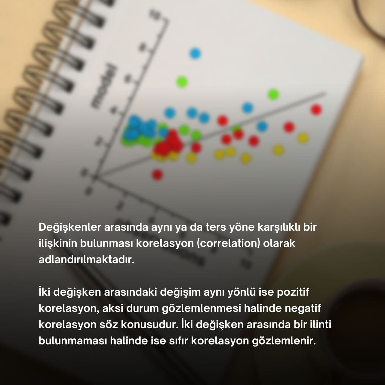 Değişkenler arasında aynı ya da ters yöne karşılıklı bir ilişkinin bulunması korelasyon (correlation) olarak adlandırılmaktadır. İki değişken arasındaki değişim aynı yönlü ise pozitif korelasyon, aksi durum gözlemlenmesi halinde negatif korelasyon söz konusudur. İki değişken arasında bir ilinti bulunmaması halinde ise sıfır korelasyon gözlemlenir.