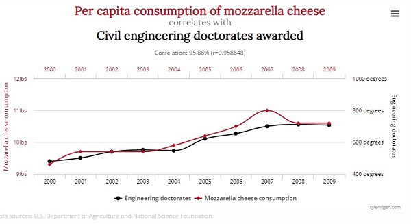 Ya da Kişi başına düşen mozarella peyniri tüketimi ile inşaat mühendisliği doktorası sayısı…